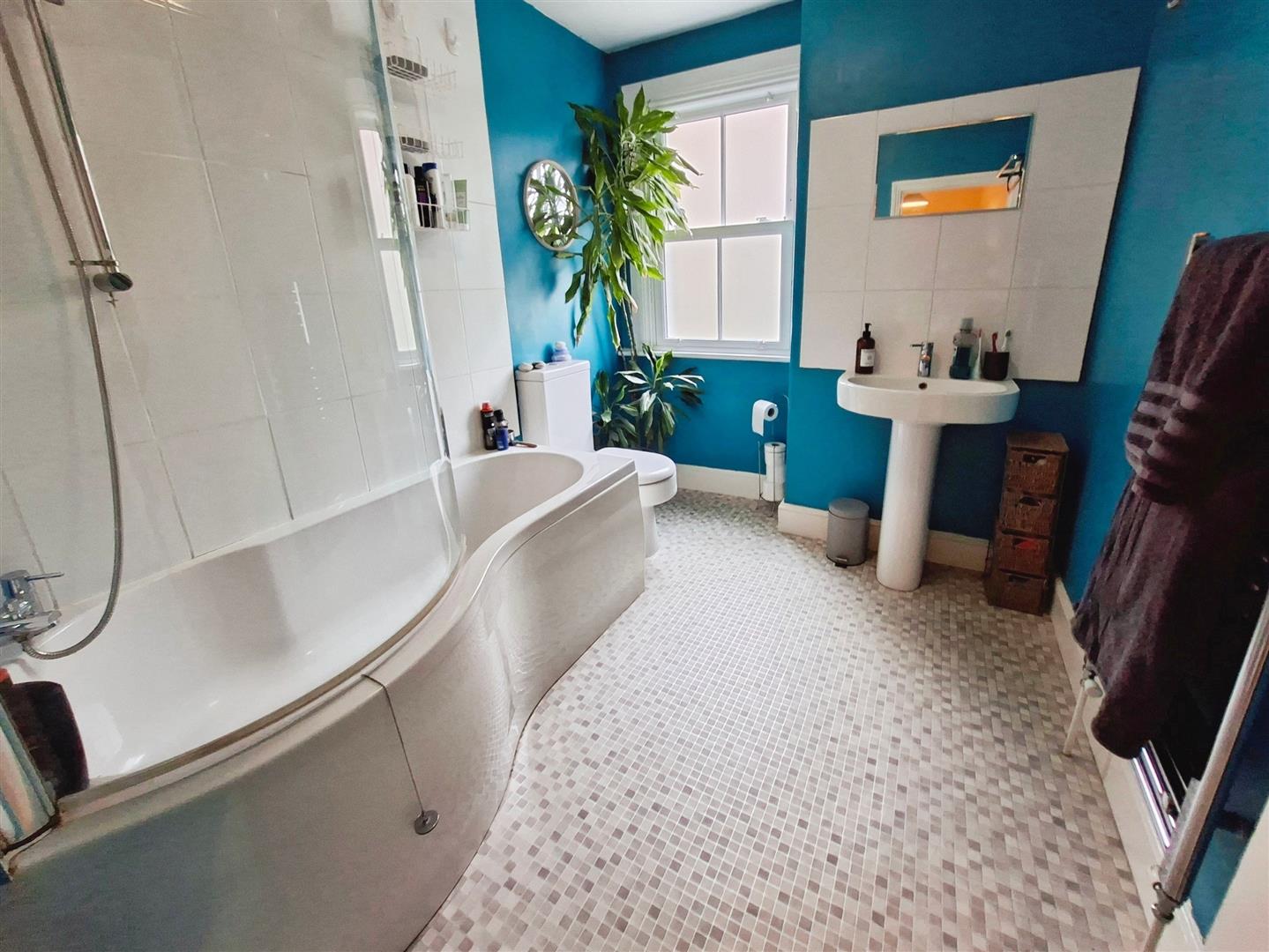 Good size stylish bathroom, with white suite consisting of bath with shower over, WC and basin, partial white wall tiles and attractive contrasting decor, chrome radiator, sash window to rear, neutral vinyl flooring. A great place to start and finish your day.