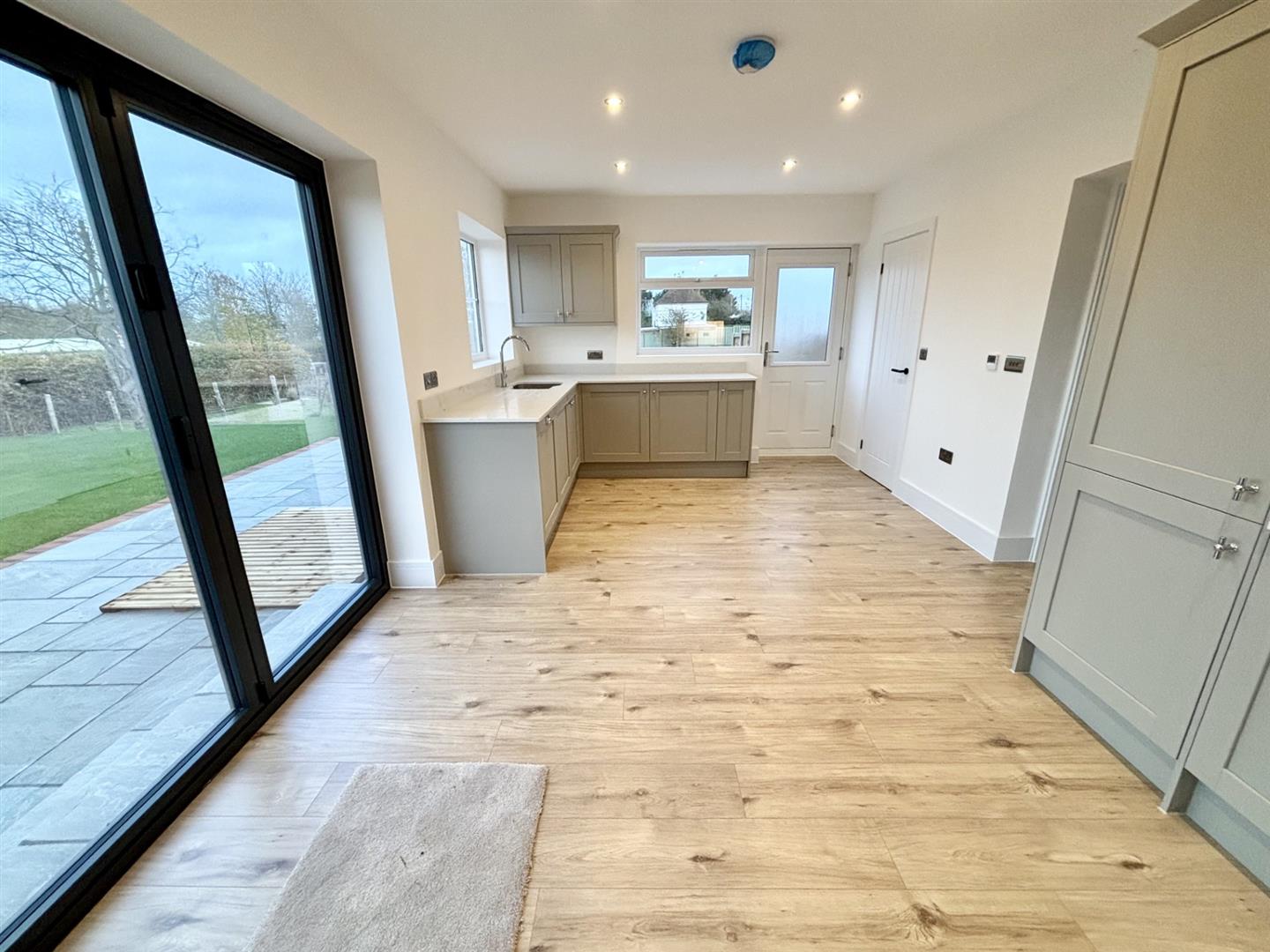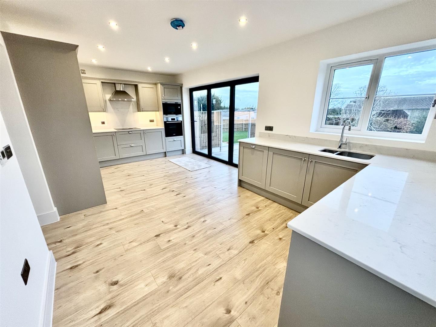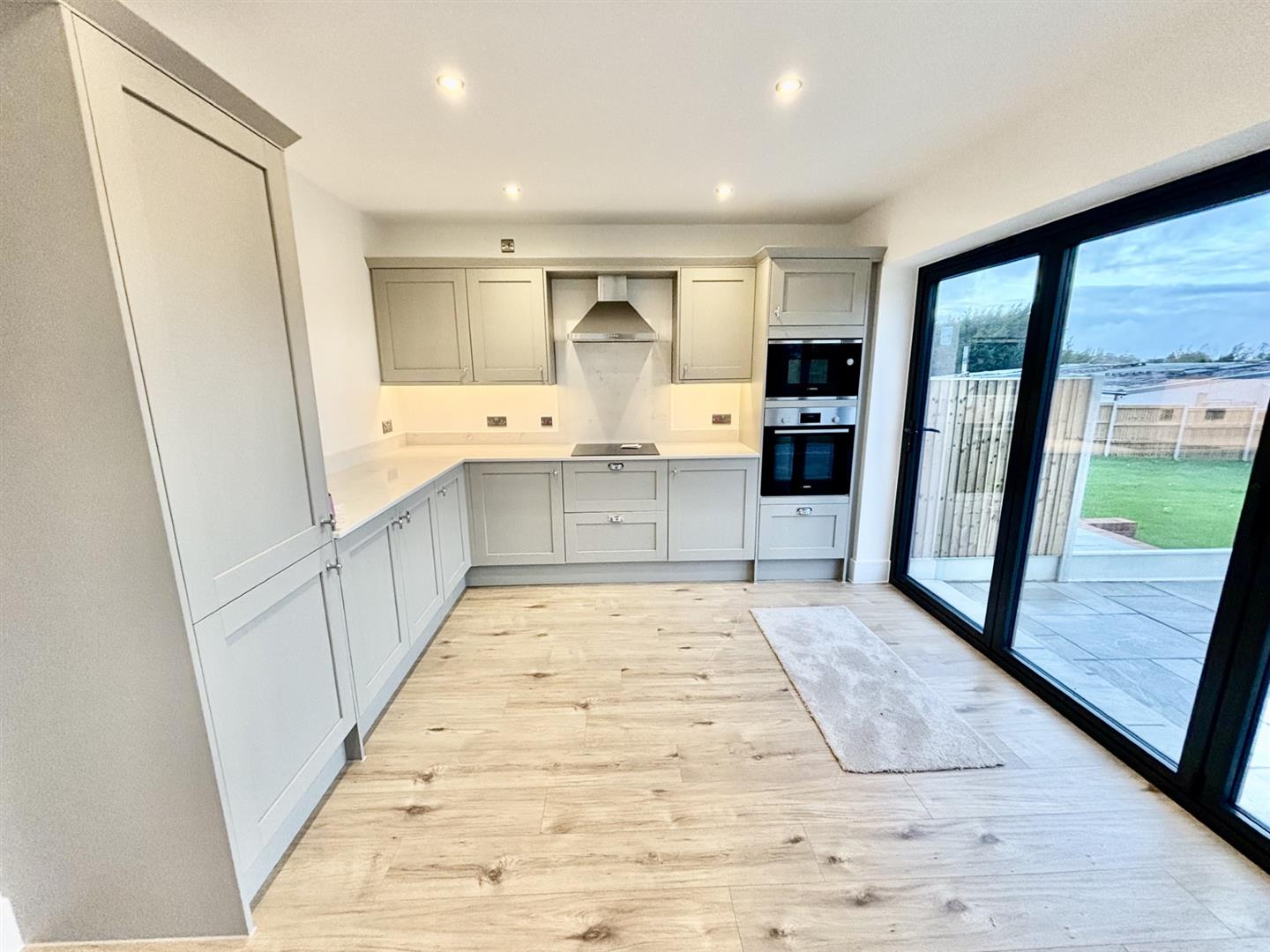 Double glazed window to side and rear. Double bi-fold doors to garden and double glazed door to side. Extensive range of wall and base units with contrasting work surfaces, sink and drainer unit. Built-in dishwasher, microwave, oven and induction hob with extractor fan over. Wood-panelled flooring with under-floor heating.