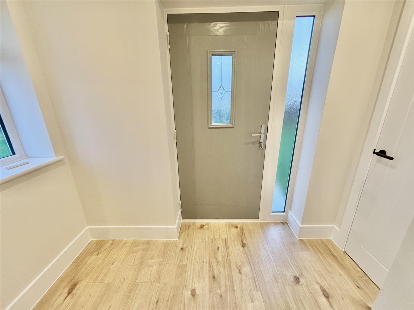 UPVC door to front, window to front and side, wood panelled flooring with built-in cupboard.