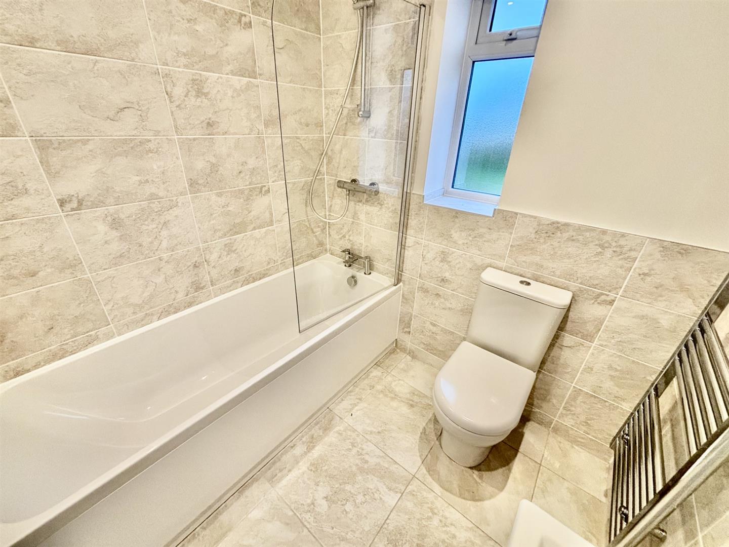 Double glazed window to side, tiled flooring and walls, heated towel rail, panelled bath with shower over, wash basin and W/C.